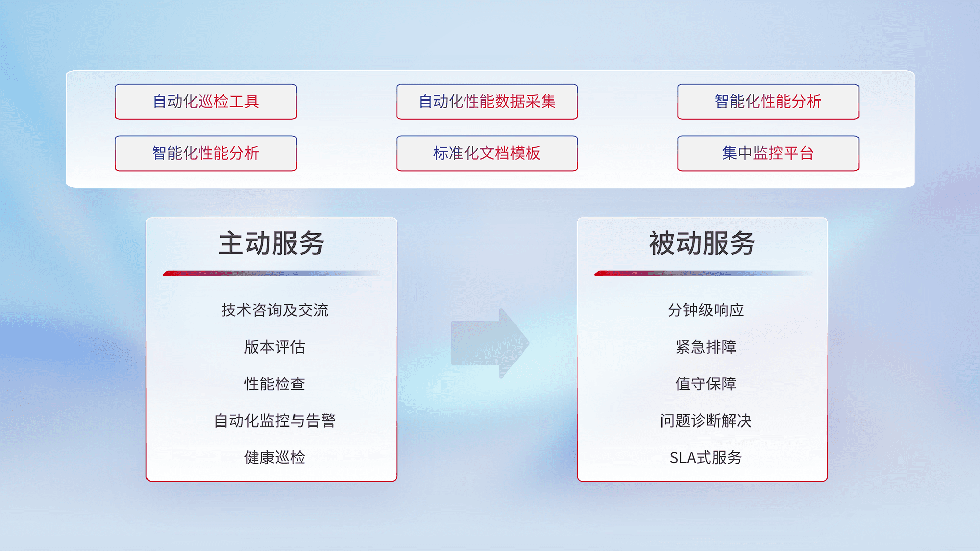 智能化工具和标准化文档,,保障服务质量,,,提供主动服务(包含技术咨询、、、、版本评估、、、性能检查、、、、自动化监控与告警、、健康巡检)和被动服务包含(分钟级响应、、紧急排障、、、、值守保障、、问题诊断解决、、、、SLA服务)。。